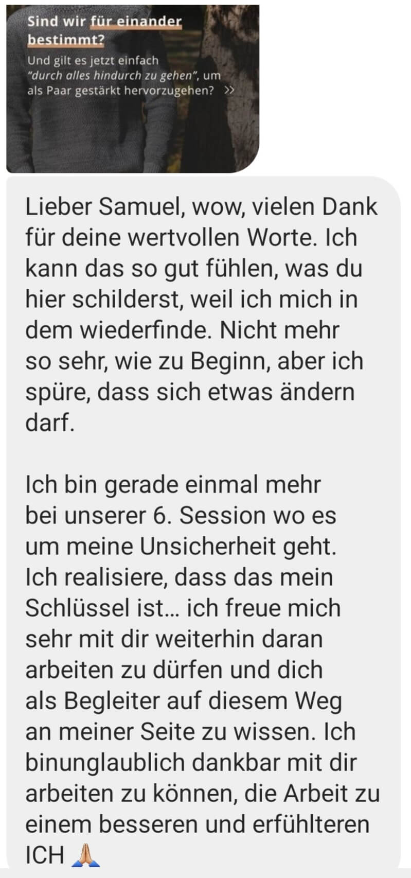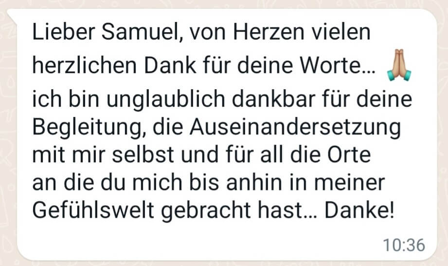 Am wertvollsten war für mich deine Hingabe, Empathie und Wärme. Ich konnte mich dir gegenüber bedingungslos öffnen. Es tauchen deine Worte und dein Input immer wieder auf und helfen mir in "neuen" Bahnen zu denken, fühlen und wahrzunehmen.