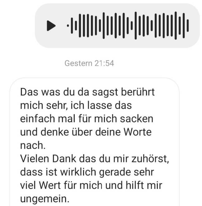 Du hast einen großen Beitrag geleistet, dass wir jetzt an dem Punkt stehen, wo wir sind. Wir haben nach wie vor schwierige Themen, die wir noch bearbeiten werden, aber ich blicke heute entspannt auf die nächsten Schritte. Ich möchte weiter diesen Weg gehen, in dem ich in mir nach Antworten suche.