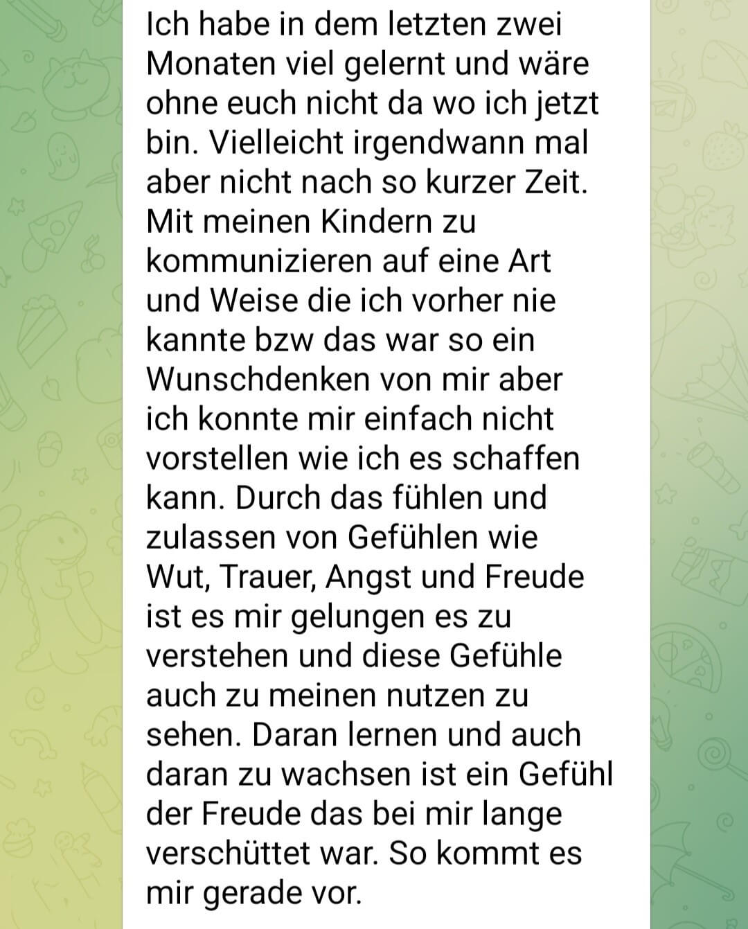 Zusätzlich steht dir über die 12 Wochen unserer gemeinsamen Reise eine Telegram-Gruppe für Austausch zur Verfügung.