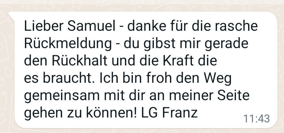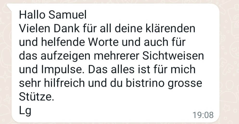 Samuel schafft es, die richtigen Fragen zu stellen. Ich bin froh, dass ich mich für das Coaching entschieden habe.